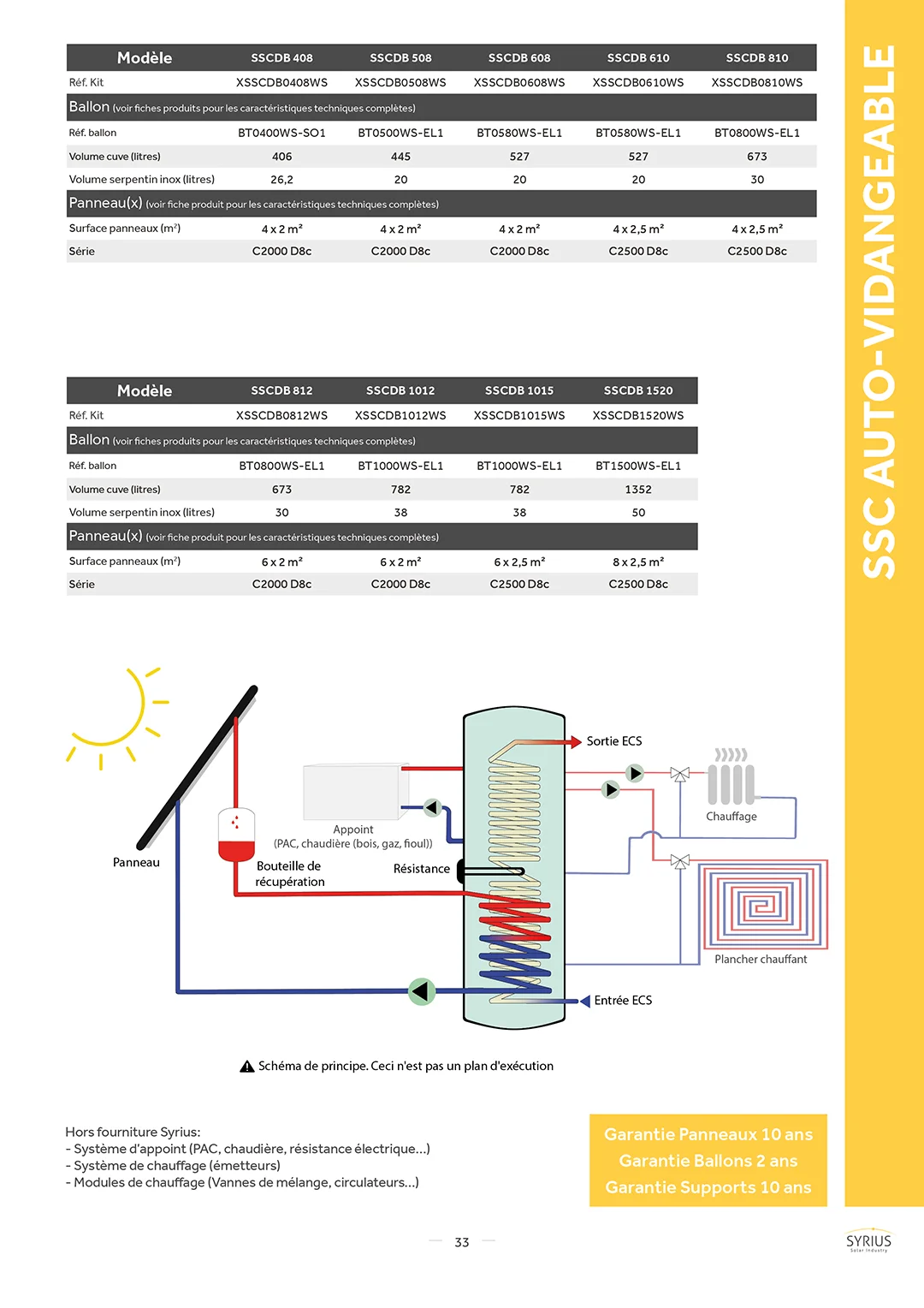 Un système solaire combiné permet de produire de la chaleur solaire, pour le chauffage et l’eau chaude sanitaire. Cette gamme SSC en particulier propose une configuration auto-vidangeable et comporte une bouteille de récupération adaptée.