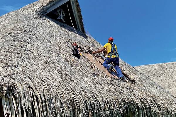Nos équipes s’adaptent à l’envrionnement et vous proposent des solutions adaptées, comme ici avec une intégration des capteurs dans la toiture et un ballon solaire dans chaque bungalow.